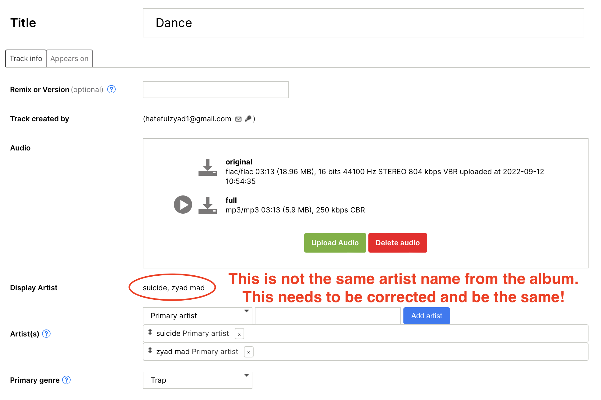 Sometimes it can just be cause of an uppercase on your title in the release level, and not in your track level.
